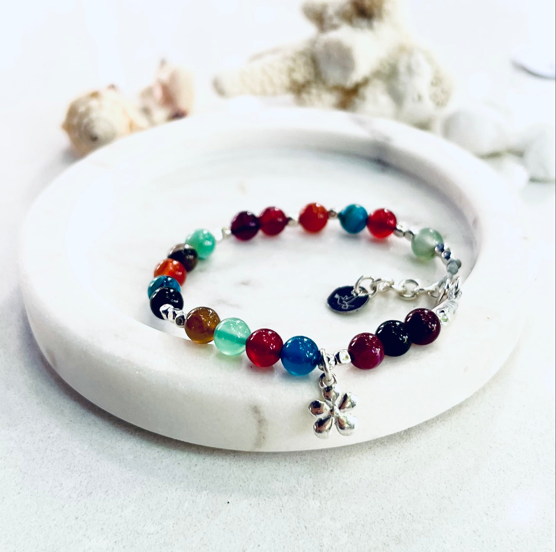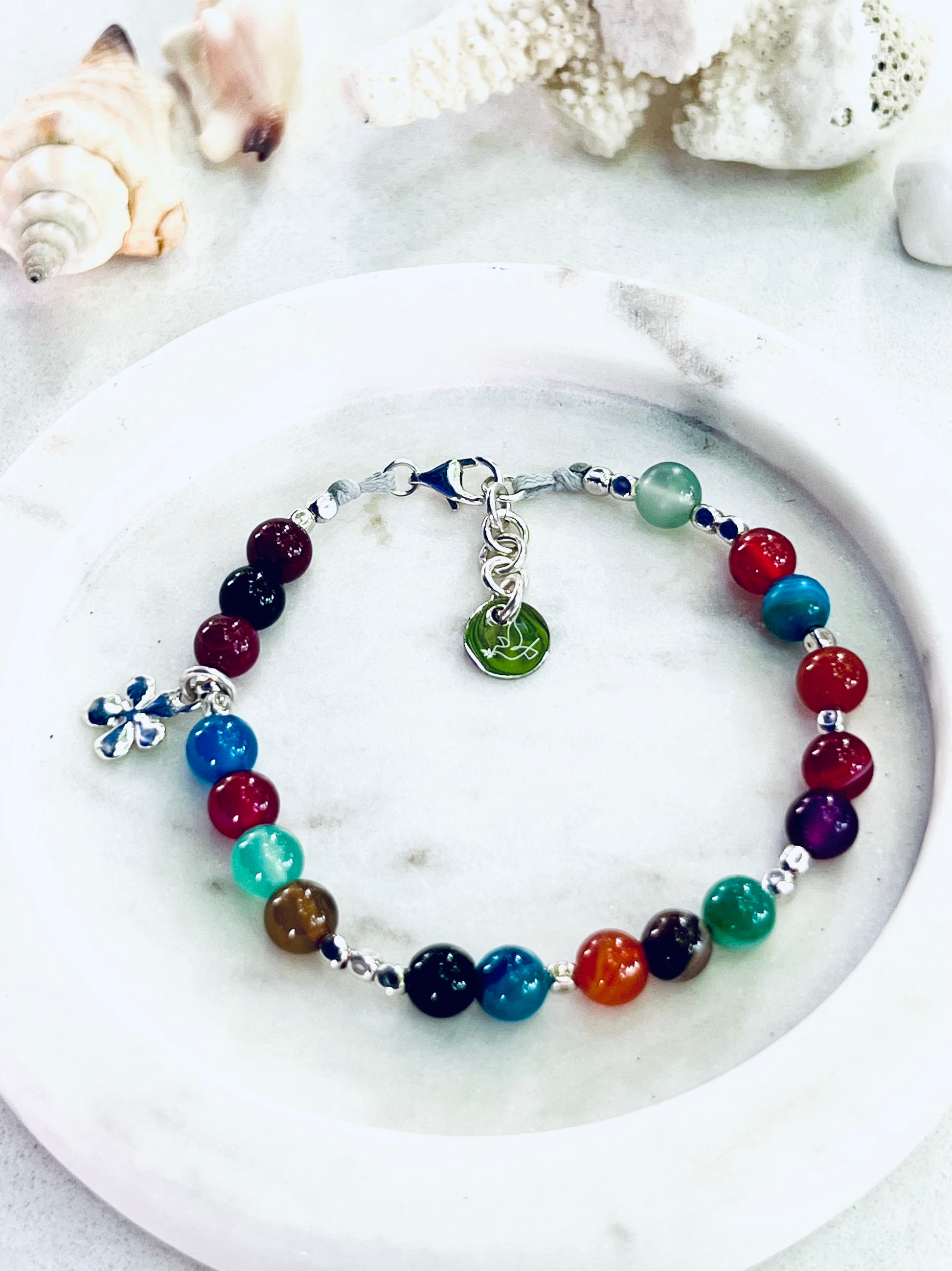 A variety of stunning semi-precious gems and our signature 925 solid Italian silver beads are threaded onto quality and durable cord, finished with a 925 sterling silver daisy flower charm and a 2.5 cm extension chain.