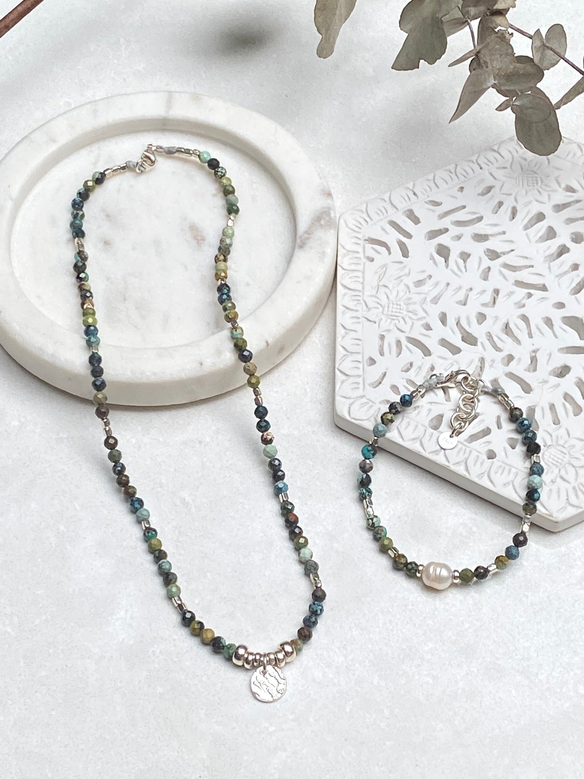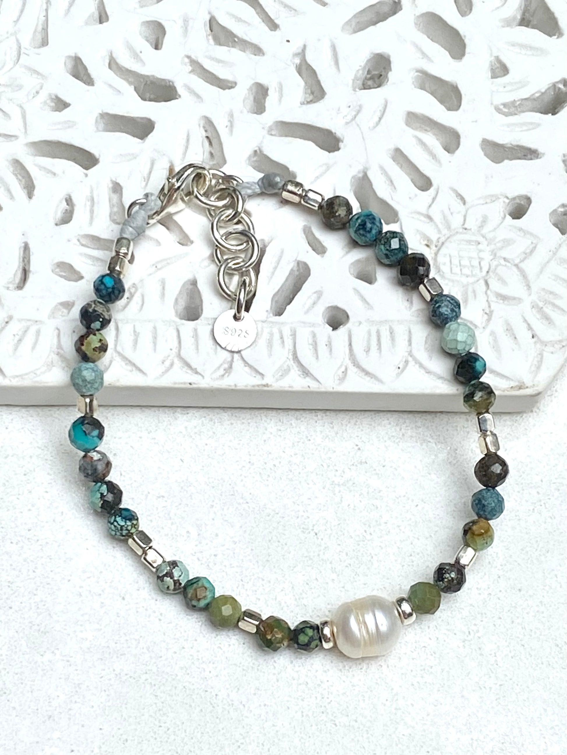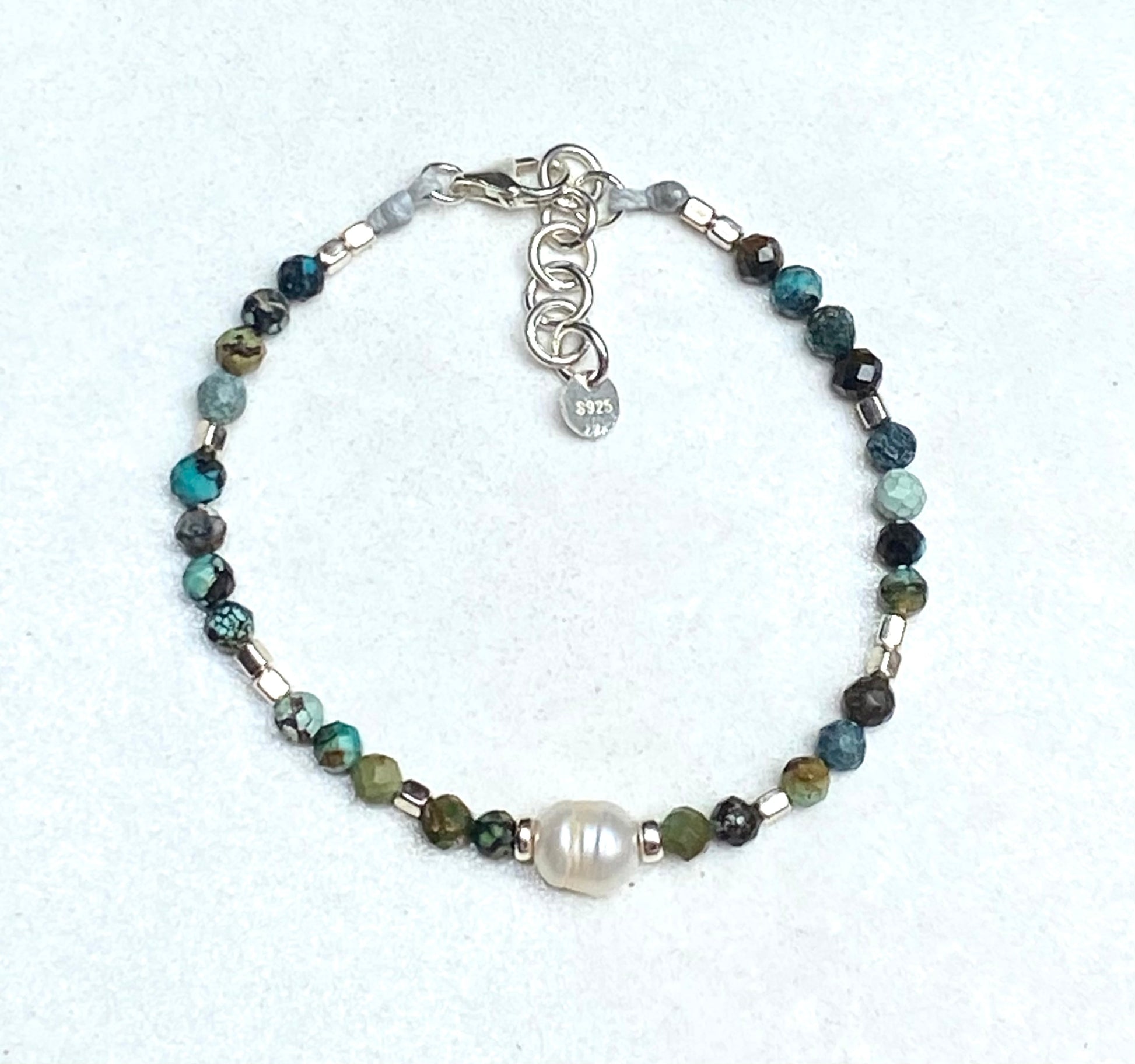 Stunning bracelet handcrafted with Turquoise stones and our signature 925 Italian silver beads, threaded onto quality and durable cord, finished with a gorgeous freshwater pearl.