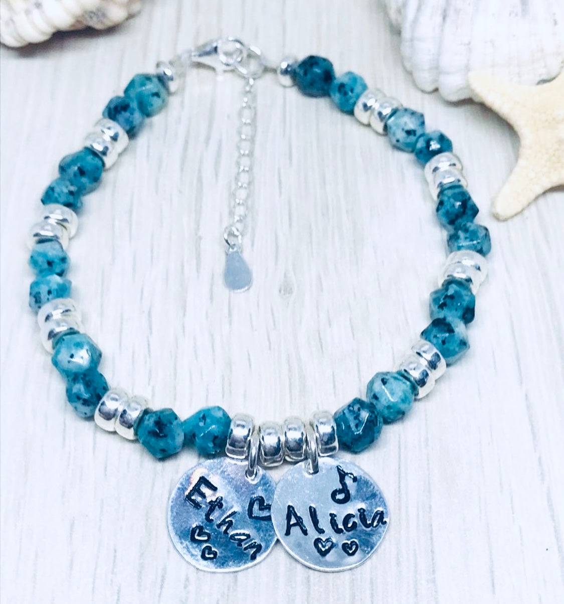 This unique bracelet was custom made for a beautiful client with hand stamped 925 silver charms and a handmade bracelet.