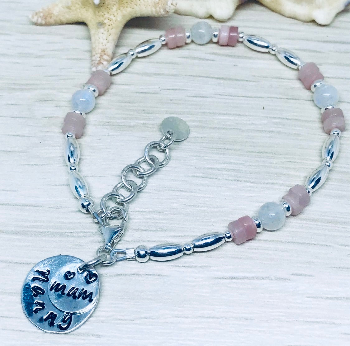 This unique bracelet was custom made for a beautiful client with hand stamped 925 sterling silver charm and a handcrafted bracelet made with gemstones and solid Italian silver.