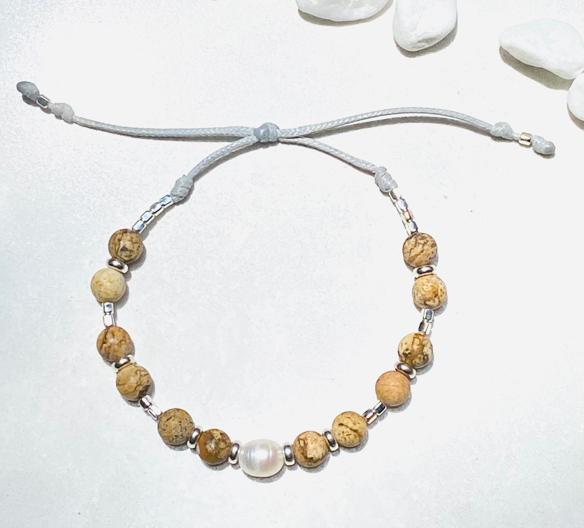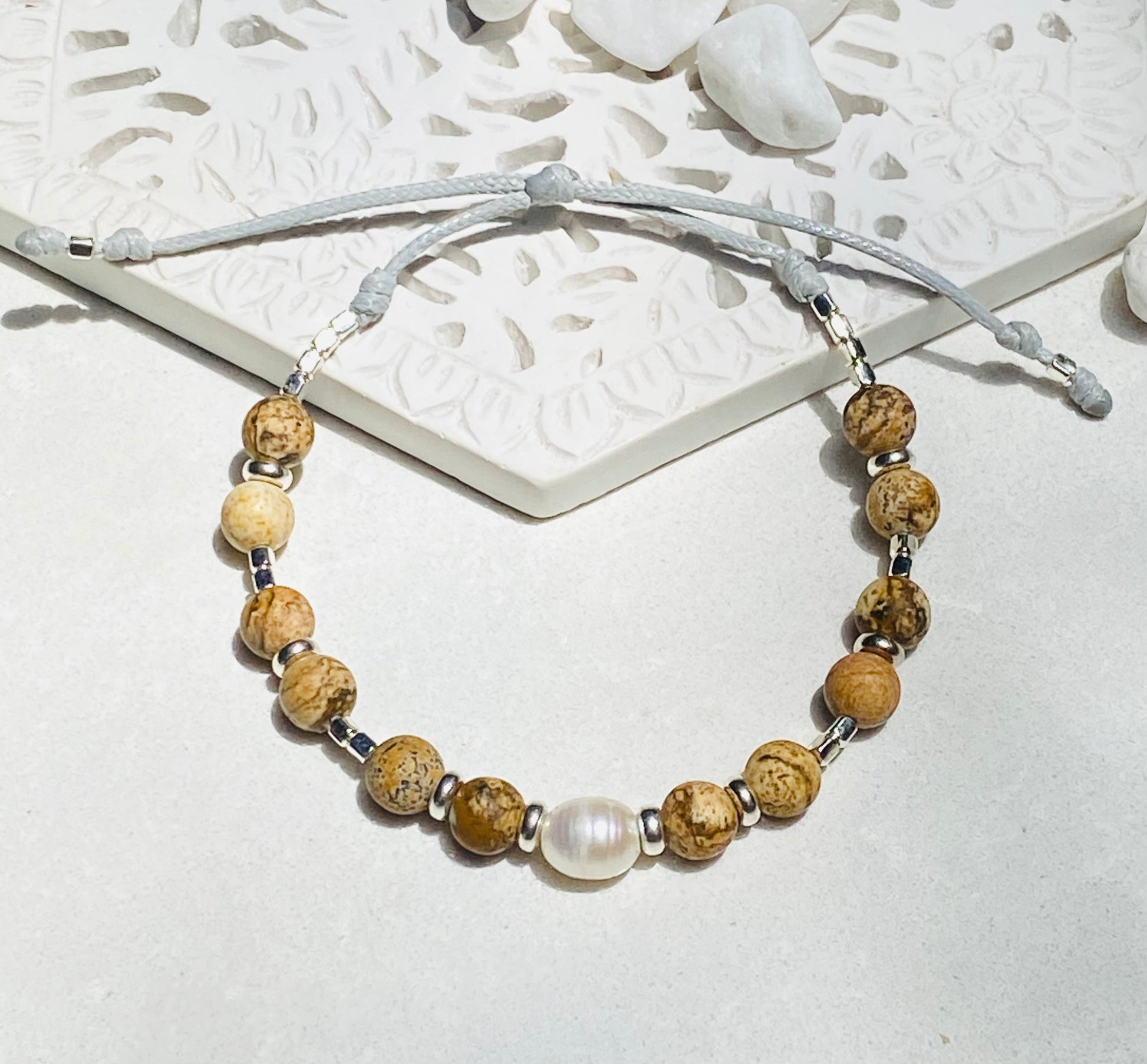 Designed to stand out, this gorgeous bracelet has been handcrafted with matted jasper, our signature 925 Italian silver beads, finished with a fresh water pearl and threaded onto quality and durable cord.