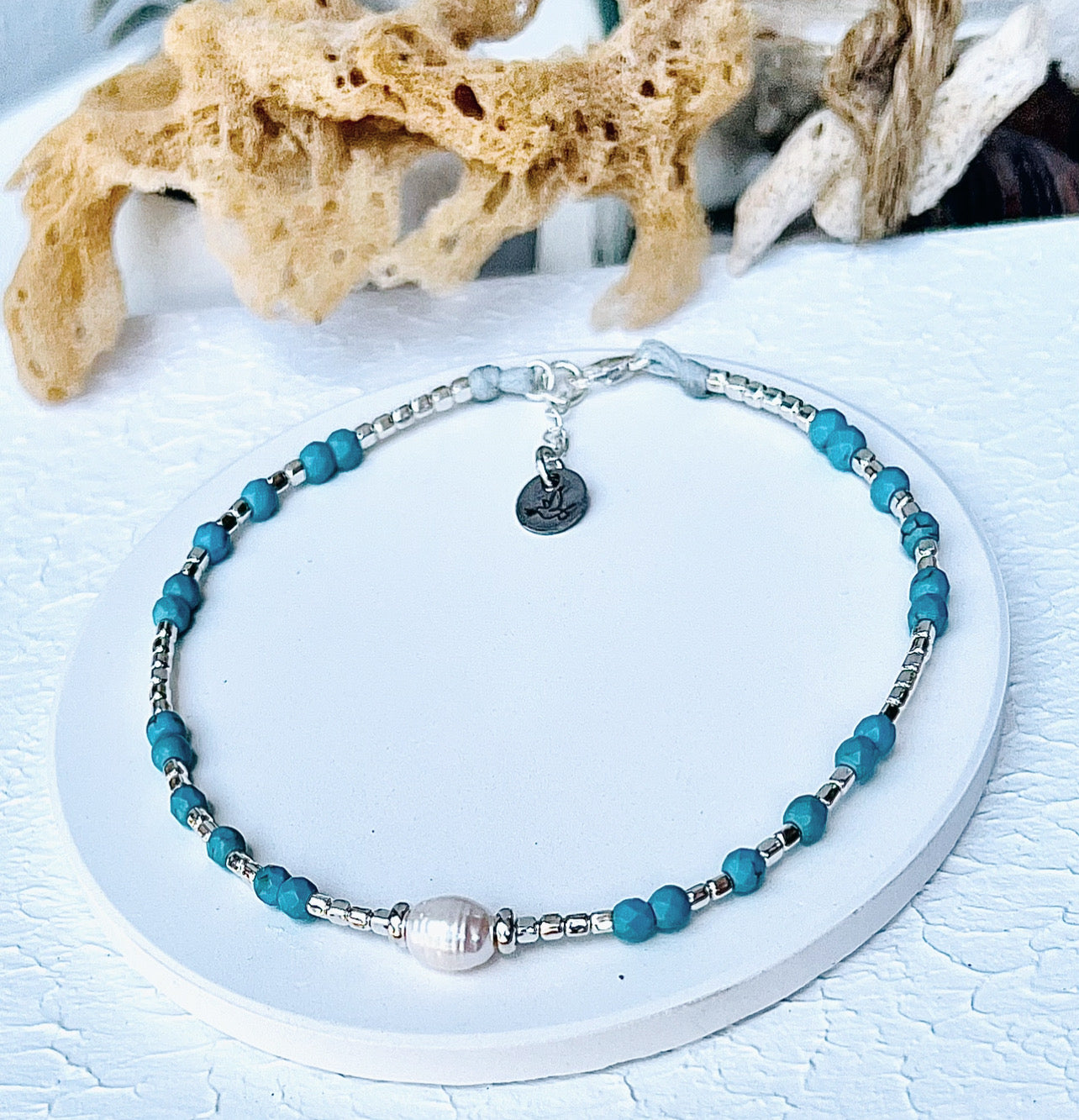 Stunning anklet handmade with 925 solid Italian silver, turquoise stones and finished with a natural freshwater pearl.