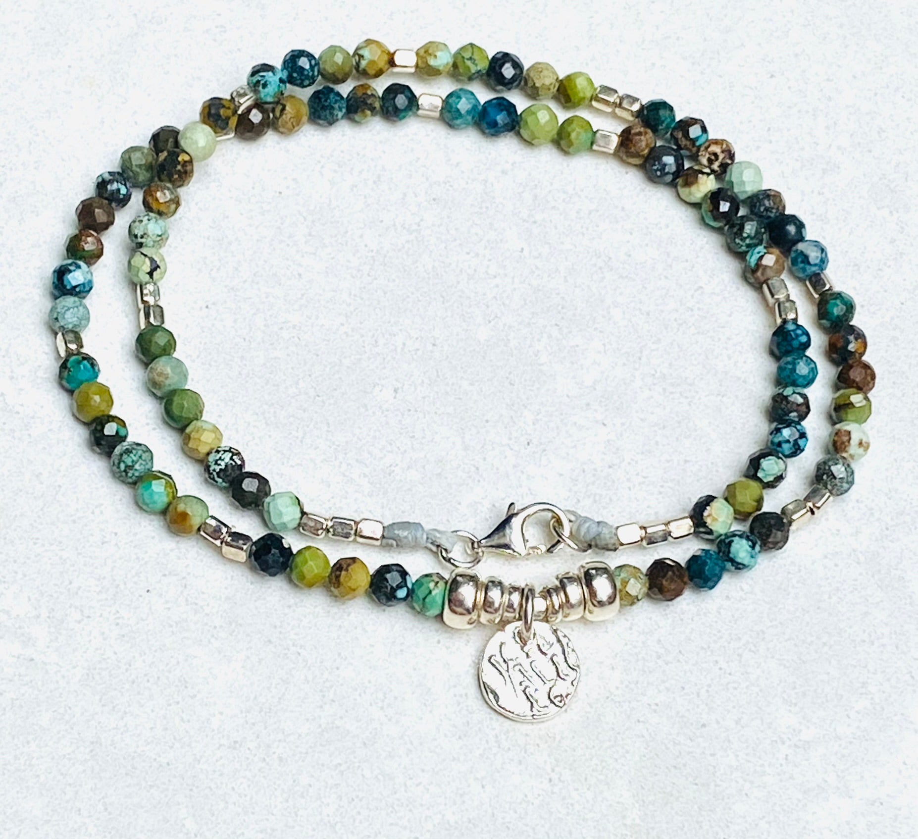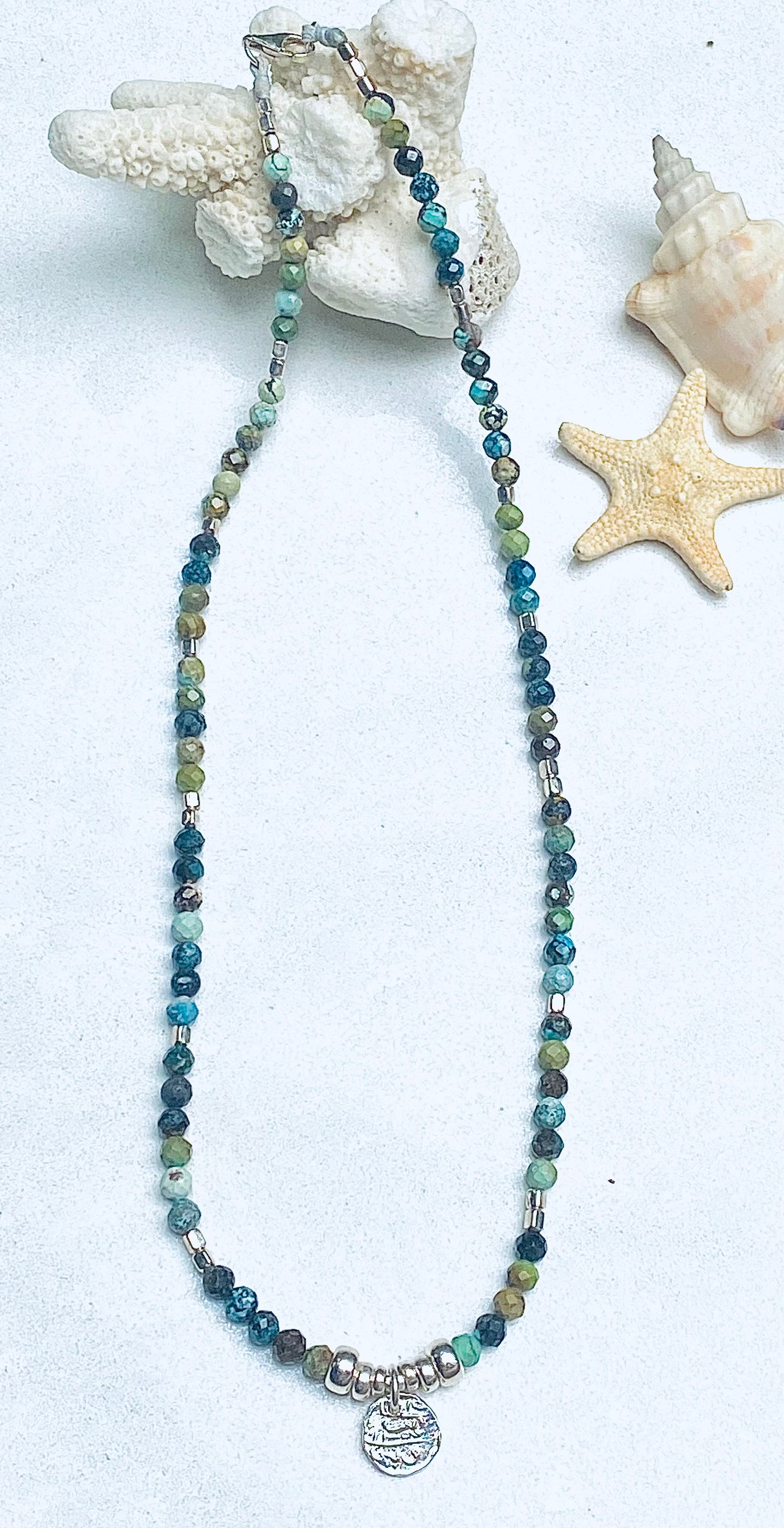 Stunning choker necklace handcrafted with Turquoise stones and our signature 925 Italian Silver beads, threaded onto quality and durable cord, finished with a gorgeous sterling silver charm.
