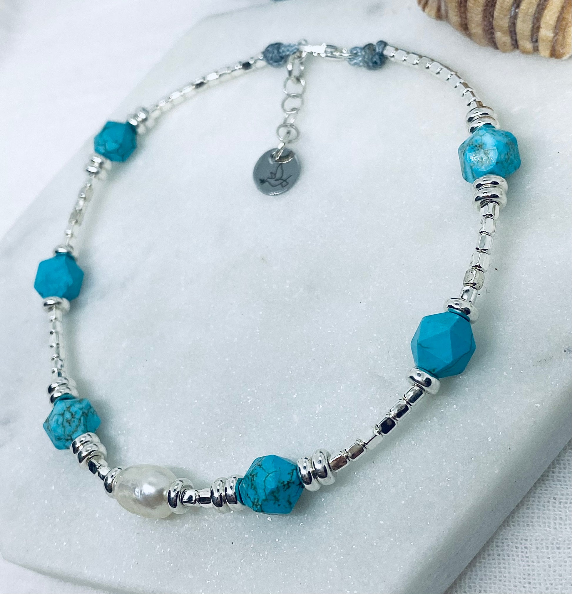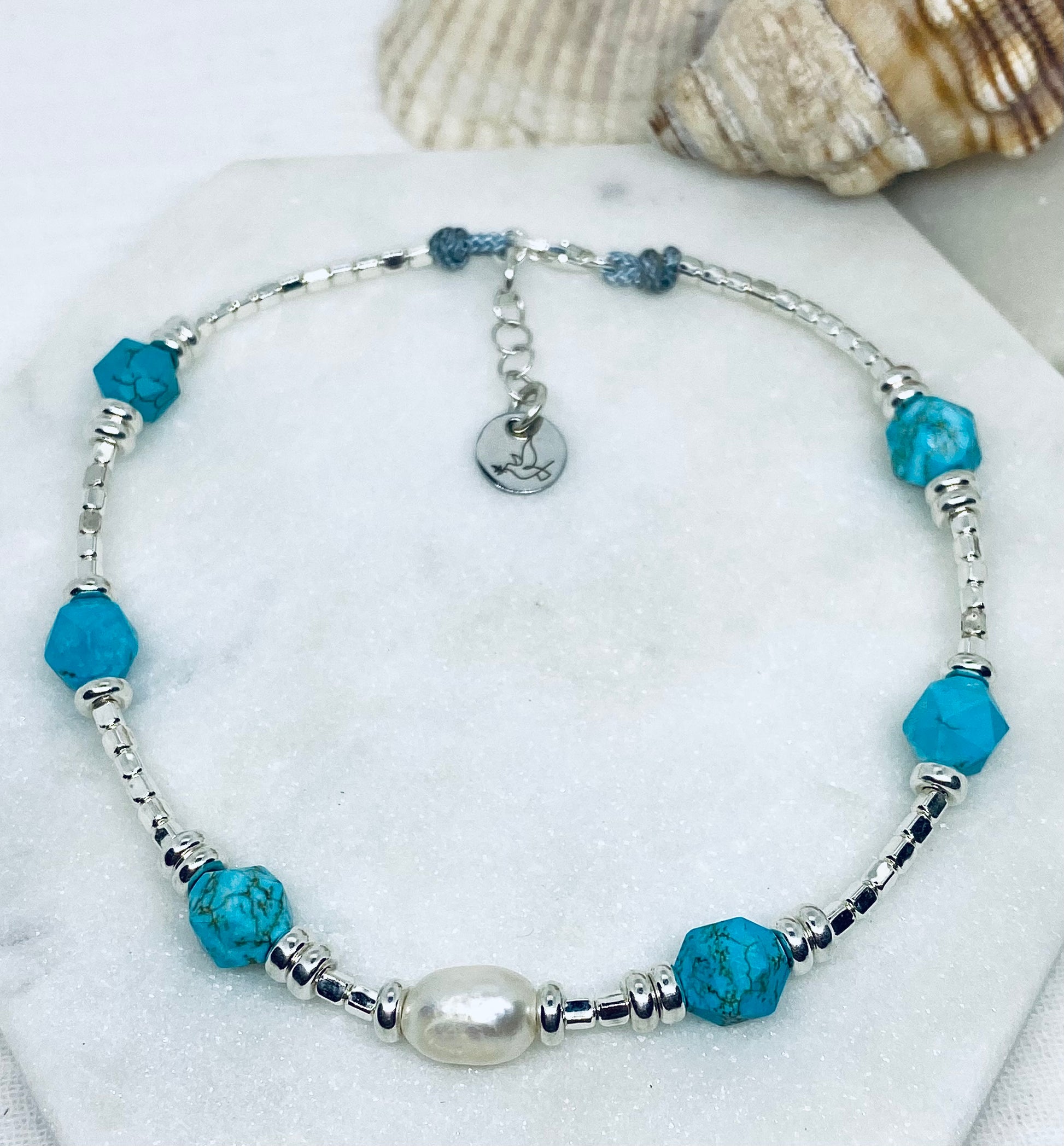 Stunning anklet handmade with 925 solid Italian silver, turquoise stones and finished with a natural freshwater pearl.