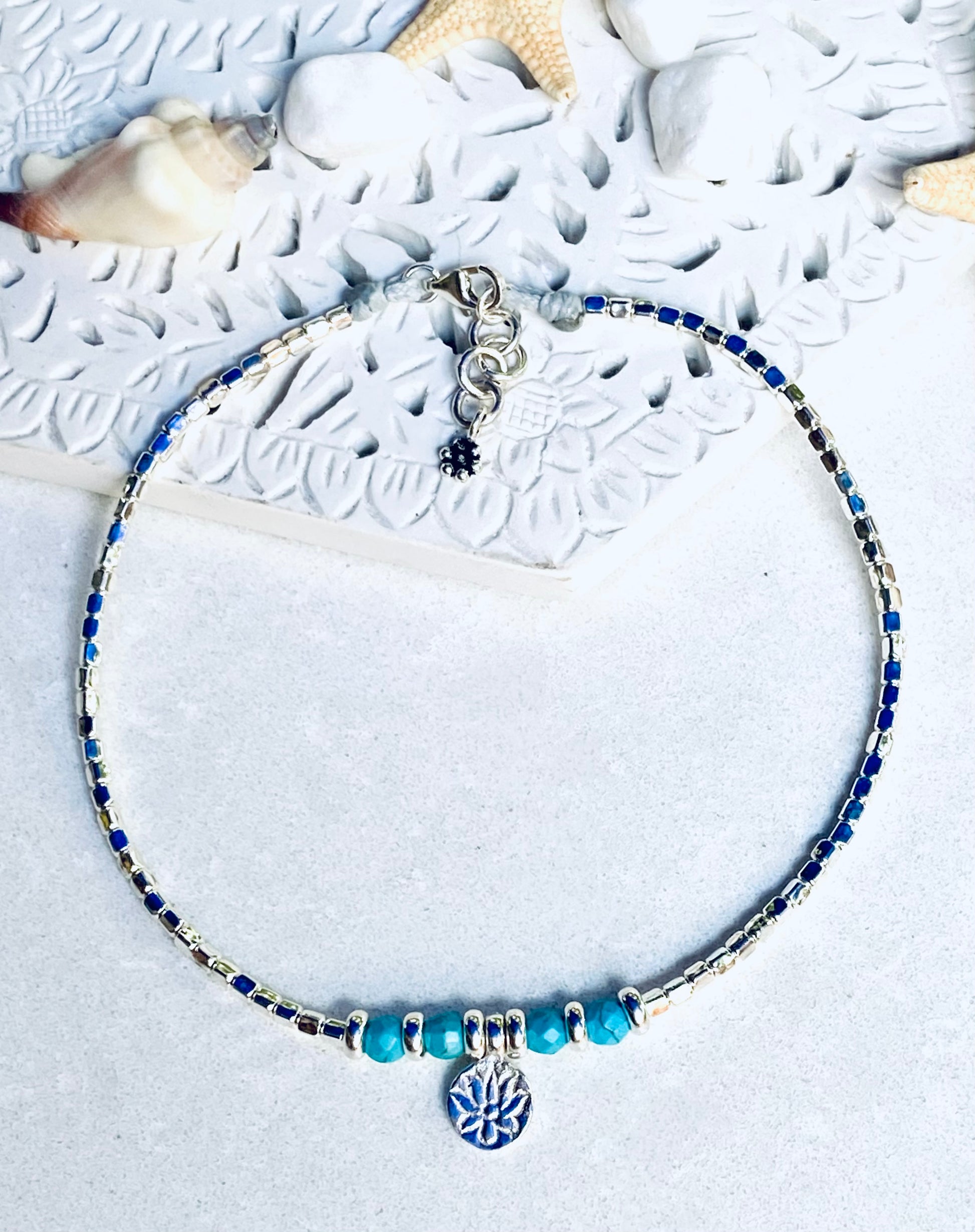 Boho anklet handmade with turquoise stones and our signature 925 Italian silver beads, threaded onto quality and durable cord, finished with a gorgeous lotus flower charm.