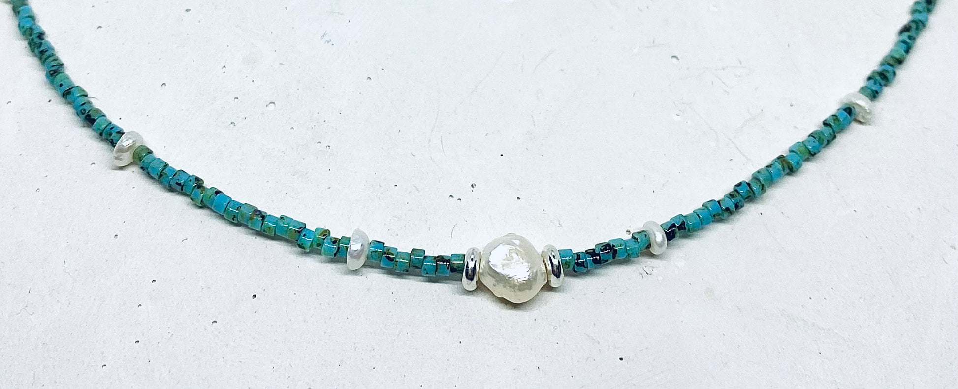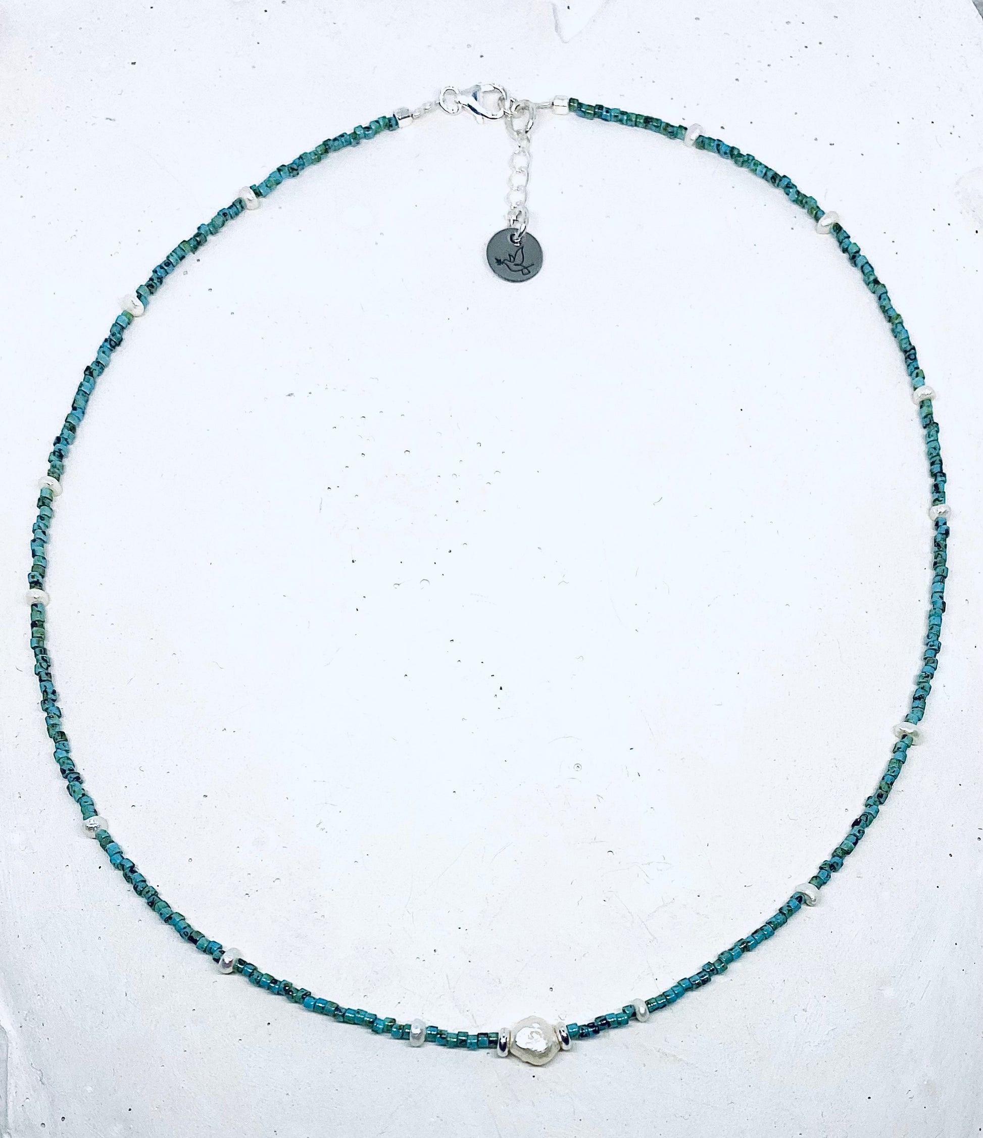 Unique summer choker handcrafted with Picasso style Czech beads with a touch of black and our signature solid 925 Italian silver, finished with gorgeous freshwater pearls.